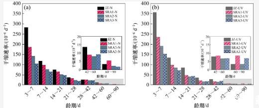 從圖3中可以觀察到,隨著齡期的延長,干縮曲線SRA2-UV逐漸接近于干縮曲線SRA3-UV,而SRA3-UV的干縮值沒有進一步降低。這表明上述分析是合理的。在強紫外線輻射下,當減縮劑的摻量超過3%時,其孔隙溶液中的SRA濃度超過臨界濃度(CMC),進一步增大摻量不能增強SRA在該應用環境中的減縮效果。