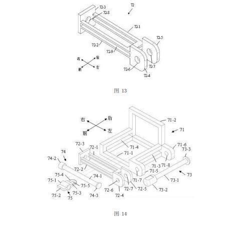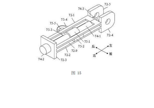 如圖10、圖11和圖14所示,滑動座72活動設(shè)置于固定座71上。滑動座72的第一U形板72-1和第二U形板72-2的左端均穿入固定座71的左邊框的第一方孔71-3內(nèi),第一U形板72-1和第二U形板72-2的右端均穿入固定座71的右邊框的第二方孔71-4內(nèi);蓋形板72-3的左側(cè)面與固定座71的右邊框的右側(cè)面相抵接,使得蓋形板72-3對滑動座72起限位作用;第一尾板72-4和第二尾板72-5的右端面均與固定座71的左邊框的左側(cè)面相抵接,使得第一尾板72-4和第二尾板72-5對滑動座72起限位作用,并且第一尾板72-4和第二尾板72-5均位于第一延伸板71-5與第二延伸板71-6之間。