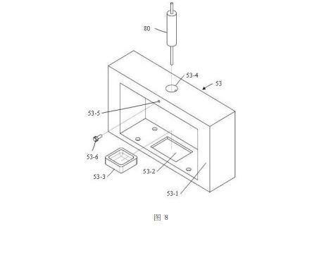 如圖8所示,第三窗形件53的第三邊框部53-1的下邊框上設(shè)置有一個例如長方形的凹坑53-2,并且沿左右方向凹坑53-2位于第三邊框部53-1的中間位置,凹坑53-2內(nèi)設(shè)置有一個積液盆53-3。第三窗形件53的第三邊框部53-1的上邊框上設(shè)置有一個例如圓形的第三通孔53-4,第三通孔53-4沿豎直方向延伸,并且第三通孔53-4位于凹坑53-2的正上方;注射器80包括主體管80-1和固定設(shè)置于主體管80-1下端面的針管80-2,主體管80-1和針管80-2均為內(nèi)部中空的圓形管,并且針管80-2的直徑小于主體管80-1的直徑,針管80-2與主體管80-1的內(nèi)部空腔相連通;注射器80的主體管80-1固定設(shè)置于第三通孔53-4內(nèi),并且針管80-2的末端剛好與攝像機(jī)61的中心軸線(即光源62的中心軸線)相交。在本實(shí)施例中,第三窗形件53的第三邊框部53-1的上邊框的側(cè)面設(shè)置有一個沿前后方向延伸的第一螺紋孔53-5,并且第一螺紋孔53-5與第三通孔53-4相連通;螺栓53-6設(shè)置于第一螺紋孔53-5內(nèi),螺栓53-6的外螺紋能夠與第一螺紋孔53-5相嚙合,并且螺栓53-6的里端能夠與注射器80的主體管80-1外壁相抵接,從而使得注射器80的主體管80-1固定設(shè)置于第三通孔53-4內(nèi)。