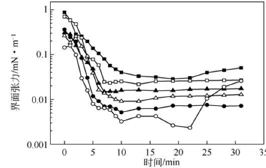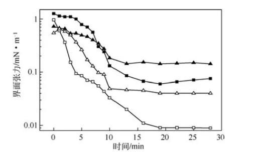 圖7不同助劑對(duì)復(fù)配體系油/水動(dòng)態(tài)界面張力的影響