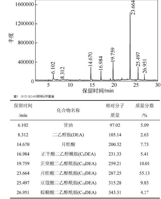 取一定量的GYD,用甲醇作溶劑,將其稀釋至約0.4%的質(zhì)量分?jǐn)?shù)后,進(jìn)行GC-MS全掃描分析,得總離子流色譜圖見圖1。用氣相色譜數(shù)據(jù)處理系統(tǒng),以峰面積歸一法測(cè)得其中各組分的相對(duì)質(zhì)量分?jǐn)?shù),分析結(jié)果見表2。從表2可以看出,GYD是一種組成復(fù)雜的烷基醇酰胺混合物,主要包括不同碳數(shù)脂肪酸二乙醇酰胺和剩余原料甘油、二乙醇胺、月桂酸等。其中,月桂酸二乙醇酰胺相對(duì)含量最高為55.13%。