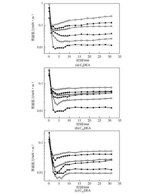 圖4 C8 DEA、C10 DEA、C16 DEA對(duì)C12 DEA/C14 DEA復(fù)配體系油/水動(dòng)態(tài)界面張力的影響