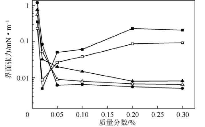 圖2不同烷醇酰胺油/水界面張力穩(wěn)定值隨質(zhì)量分?jǐn)?shù)的變化曲線