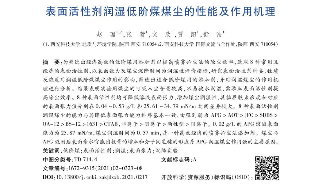 摘要:為篩選出經濟高效的低階煤用添加劑以提高噴霧抑塵法的除塵效率,選取8種常用且經濟的表面活性劑,以表面張力及煤塵沉降時間為潤濕性評價指標,研究表面活性劑種類、性質及濃度對潤濕低階煤煤塵作用的影響,篩選出適合低階煤用的添加劑,并對潤濕煤塵的作用機理進行分析。結果表明實驗用煤塵的可吸入塵含量較高,不易被水潤濕,需添加表面活性劑提高除塵效率。8種表面活性劑均可降低溶液表面張力,增加煤塵潤濕性,其臨界膠束濃度和對應的表面張力值分別在0.04~0.53 g/L和25.61~34.79 mN/m之間差異較大。8種表面活性劑潤濕煤塵的能力與其降低表面張力能力排序基本一致,由強到弱為APG>AOT>JFC>SDBS>OA-12>BS-12>1631>CTAB,非離子>陰離子>兩性型>陽離子。0.02 g/L的APG溶液表面張力為25.87 mN/m,煤塵潤濕時間為0.57 min,是一種高效經濟的噴霧抑塵法添加劑。煤塵與APG吸附后表面親水官能團數(shù)量的增加和分子間氫鍵的形成是APG潤濕煤塵作用強的主要原因。