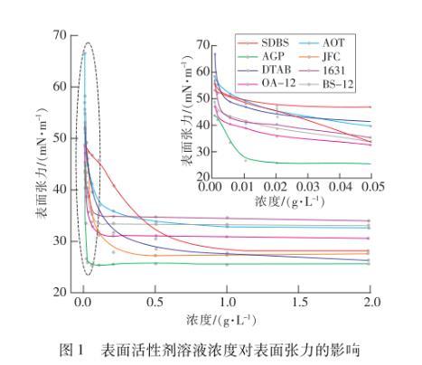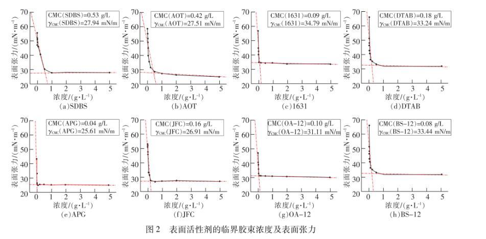 由圖2可見,8種表面活性劑溶液表面張力隨濃度變化的趨勢大體上相同,但其臨界膠束濃度及表面張力有較大差別。溶液臨界膠束濃度越小,說明表面活性劑分子在溶液中形成膠束的能力越強。8種表面活性劑的臨界膠束濃度主要集中在濃度為0.1~0.4 g/L左右,其中APG的臨界膠束濃度最小為0.04 g/L,SDBS的最大為0.53 g/L,8種表面活性劑形成膠束能力由強到弱排序為:APG>BS-12>1631>OA-12>JFC>DTAB>AOT>SDBS,總體呈現出兩性型>非離子型>陽離子型>陰離子型的規律。溶液的γcmc值越小,表面活性劑降低表面張力的能力越強,陰離子和非離子型的4種表面活性劑γcmc值均較低,其中APG降低表面張力能力最強,γcmc值僅為25.61 mN/m,比水降低了65.15%。而陽離子和兩性型的表面張力較高,均在31.00 mN/m以上,1631降低表面張力的能力最弱,表面張力為34.79 mN/m。8種表面活性劑降低表面張力的能力由強到弱依次排序如下:APG>JFC>AOT>SDBS>OA-12>CTAB>BS-12>1631,總體而言,非離子型>陰離子型>兩性型>陽離子型。APG的臨界膠束濃度和表面張力都最低,這可能是因為APG分子為環狀結構,環狀結構的碳原子上連接有醇羥基,這些醇羥基與水分子之間存在強相互作用,且在水溶液中溶解度很高,因此有效降低了溶液的表面張力,也更易形成膠束。