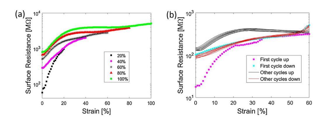 圖6。轉移到100μm厚PDMS基底上的MWCNT/P3DT單層的表面電阻與應變(a),從20%應變開始,直到100%,在同一樣品上進行20%的步驟,每次拉伸后釋放到0%。(b)在單軸應變為60%的10個周期內(每個周期之間延遲30秒)。